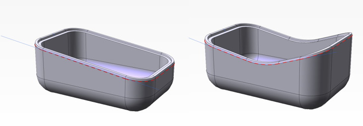 Like the selector ‘Chain‘ that is used for curves, the selection operators ‘Loop‘, ‘Loop from-to‘ and ‘Tangency Chain‘ can be applied to solids and can be used in associative modeling to generate geometries. The selector ‘Tangency Chain‘, for example, works in associative mode, regenerating the selection with an automatic search for all tangent boundaries, starting with the first selected. The example below shows the creation of a joint feature on the edges of the box. When the user changes the geometry of the boundary to create the joint, the selector “remembers” the tangency condition and allows the regeneration of the joint feature, even if the number of boundaries to be selected has been changed.