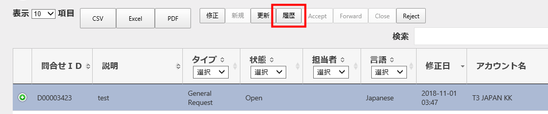 作成されたお問い合わせを選択を選択した後に(緑のプラスボタンではなく、項目の行全体を選択)、履歴ボタンをクリックします。