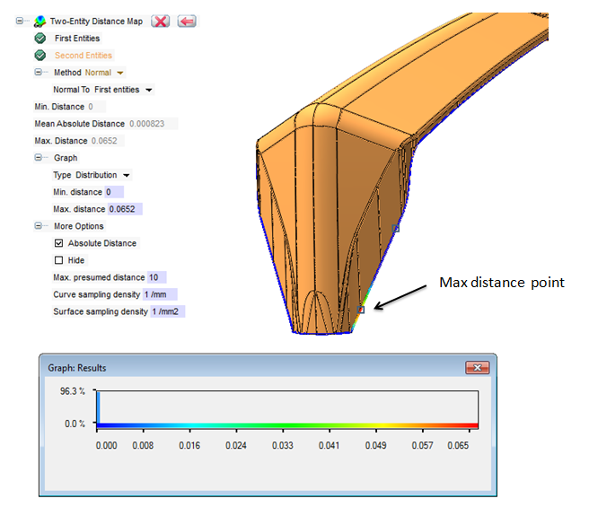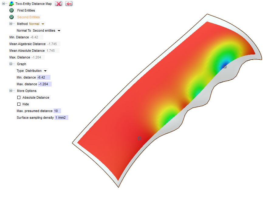 A further possibility of control is offered by the command ‘Two Entities Distance Map’. With this feature it is possible to analyze two entities, typically two surfaces, and represent the different relating distances and the areas of maximum and minimum distance, through a diagram and a different coloring. The possibility to analyze also the distances between curves and mesh files, greatly extends the range of use of this feature.