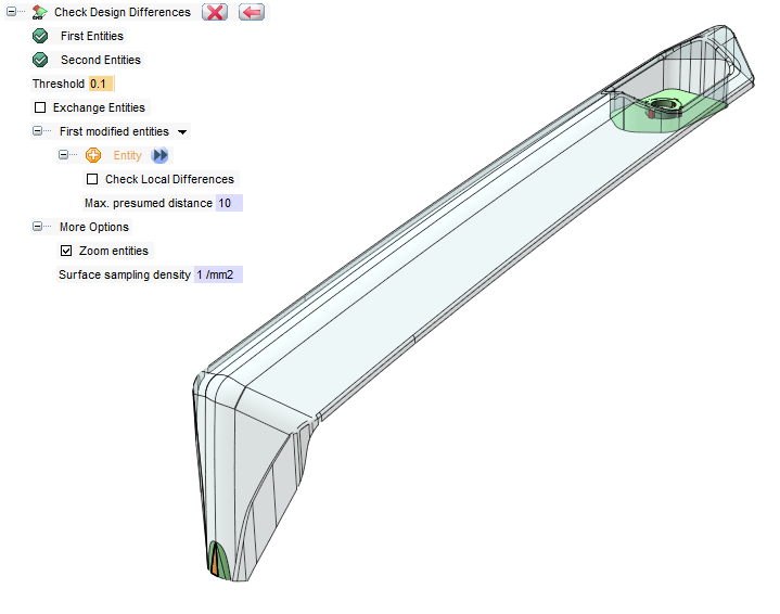 In the case of collaboration with third parties during the design phase, it is extremely important to have the possibility to quickly check eventual changes that might have been made to the model. Suppose to have started the designing of a mold and that is changed by other operators. Upon receipt of the “new” geometry it is essential to immediately identify the parts of the model that have been changed.