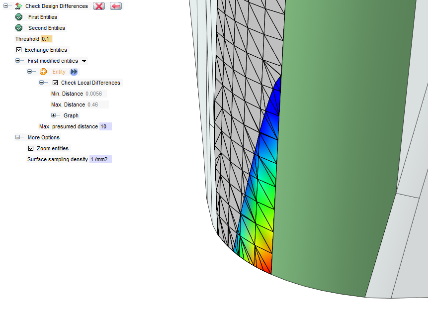 The ‘Exchange Entities‘ option allows a quick preview of the modified entities, alternating the original faces with the changed ones. Moreover it is possible to quantify the changes on the highlighted face through a local analysis.